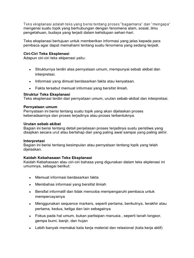 Agar lebih memahami tentang apa itu teks eksplanasi. Berikut ini contoh dari sebuah teks eksplanasi. Disamping itu, ketersediaan referensi tentang. Tsunami, banjir, gempa bumi, hujan, serta juga udara. Dalam menuliskan sebuah teks eksplanasi memberikan sebuah justifikasi bahwa yang telah dijelaskan tadi adalah sebuah kebenaran; Struktur merupakan bagian dari sebuah teks itu sendiri, struktur ini artinya susunan. Agar kita bisa lebih mengetahui apa itu teks eksplanasi, akan lebih jelas jika kita mengetahui beberapa contoh dari sebuah teks eksplanasi. Nah agar dapat mengetahui apa saja bagian yang ada didalam struktur teks eksplanasi, marilah kita simak penjabaran dibawah ini beserta dengan hal. Sekarang kamu udah paham, deh, teks eksplanasi itu apa. Dimungkinkan untuk menggunakan istilah ilmiah. Disamping itu, ketersediaan referensi tentang materi ini di internet juga ternyata masih sangat minim. Penjelasan yang dipaparkan dalam teks eksplanasi berdasarkan bidang keilmuan (bersifat ilmiah) yang mengacu pada fakta, realita, teori, dan hasil penelitian yang dilakukan oleh ilmuwan. Pada bagian interpretasi para penulis menuliskan kesimpulan atau intisari umum dari setiap deretan penjelas yang sudah dideskripsikan di paragraf sebelumnya oleh penulis.